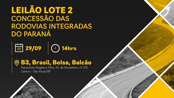 A Agência Nacional de Transportes Terrestres (ANTT) e o Ministério dos Transportes promovem, a partir das 14h desta sexta-feira (29/9), na B3 em São Paulo, o leilão de concessão do Lote 2 das Rodovias do Paraná. O projeto a ser leiloado abrange quase 605 km das BRs-153/277/369 e das rodovias estaduais PR-092/151/239/407/408/411/508/804/855, conectando importantes pontos da região, como o Porto de Paranaguá e a Região Metropolitana de Curitiba, bem como os municípios de Ourinhos e Itararé.