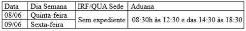 As Alfândegas da Receita Federal do Brasil em Uruguaiana e Foz do Iguaçu encaminharam seus respectivos comunicados a respeito dos horários de expediente no feriado de Corpus Christi, da próxima quinta-feira, 08 de junho. Ainda, destaca-se que o dia 09 de junho (sexta-feira) foi dado como ponto facultativo, desta forma, as importações que não forem parametrizadas até quarta-feira só serão liberadas na próxima segunda-feira (12/06).
