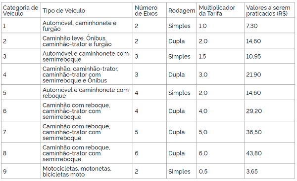 Dessa forma, o valor da tarifa passará de R$ 5,20 para R$ 5,80 na categoria de veículo 1 nas praças de pedágio P1 (Três Cachoeiras), P2 (Santo Antônio da Patrulha), P3 (Gravataí), P4 (Montenegro), P5 (Paverama), P6 (Fontoura Xavier) e P7 (Victor Graeff), no estado do Rio Grande do Sul.