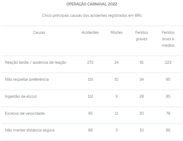 De acordo com o Setor de Estatística da PRF, no Carnaval de 2022 as cinco principais causas dos acidentes registrados em BRs foram: