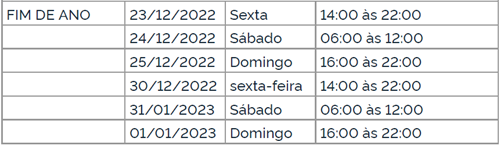 24/12/2022 e 31/12/2022- das 08h às 12h e das 14h às 18h (expediente), das 09h às 11h e das 16h às 18h (atendimento/travessias)