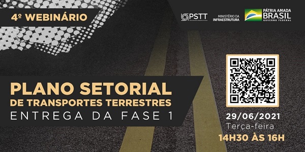 A Secretaria Nacional de Transportes Terrestres - SNTT, através do Departamento de Planejamento, Gestão e Projetos Especiais, realizará no dia 29 de junho (terça-feira), a partir das 14h30, o "4° Webinário PSTT - Entrega da Fase 1 e Próximos Passos". O evento será dedicado ao encerramento da primeira fase e ao estabelecimento das etapas de desenvolvimento da segunda fase do Plano Setorial de Transportes Terrestres – PSTT.