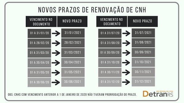 Conforme a normativa, todas as habilitações vencidas no ano de 2020, tiveram seu prazo de vigência adiado em um ano, devendo ser renovadas em 2021 conforme o mês de vencimento. Por exemplo: se a CNH venceu em janeiro de 2020, o condutor tem até 31 de janeiro de 2021 para renovar.