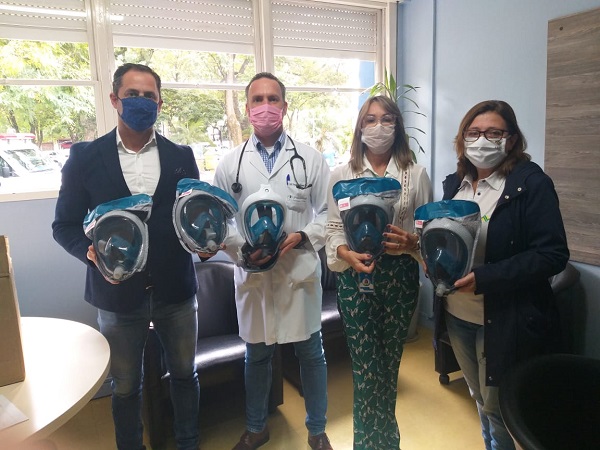 Nesta segunda-feira, 11 de maio, foi realizada a entrega de cinco máscaras de ventilação não invasiva, que podem ser utilizadas como respiradores, ao Hospital Santa Casa de Uruguaiana (HSCU). Durante a ocasião estiveram presentes, a gestora do hospital Thaís Aramburu, o médico pneumologista Luis Fernando Cibin, o prefeito Ronnie Mello, o Deputado Estadual Frederico Antunes, o representante do SDAERGS, Fábio Ciocca e a diretora executiva da ABTI, Gladys Vinci.