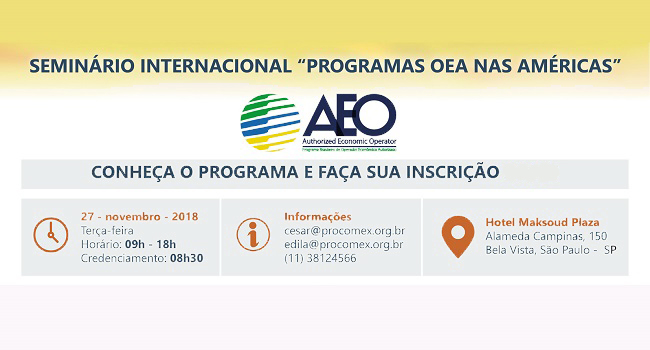 No dia 27 de novembro de 2018 acontecerá em São Paulo/SP, o Seminário Internacional "Programas OEA nas Américas". O evento é uma iniciativa da Receita Federal do Brasil e realizado pelo PROCOMEX, tem como objetivo discutir os Programas OEA nas Américas e o caminho para uma integração regional.