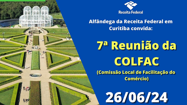 A Alfândega da Receita Federal em Curitiba vai realizar a 7ª Reunião da COLFAC (Comissão Local de Facilitação do Comércio) da unidade, a ser realizada no dia 26 de junho.