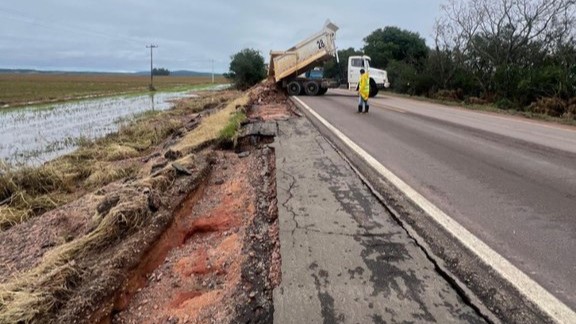 Desde a manhã desta segunda-feira (13), um dos pontos de ação está na recuperação dos acostamentos da BR-290/RS, a partir do km 115, sentido interior-capital, em Eldorado do Sul. No local está sendo executado aterro de pedra.