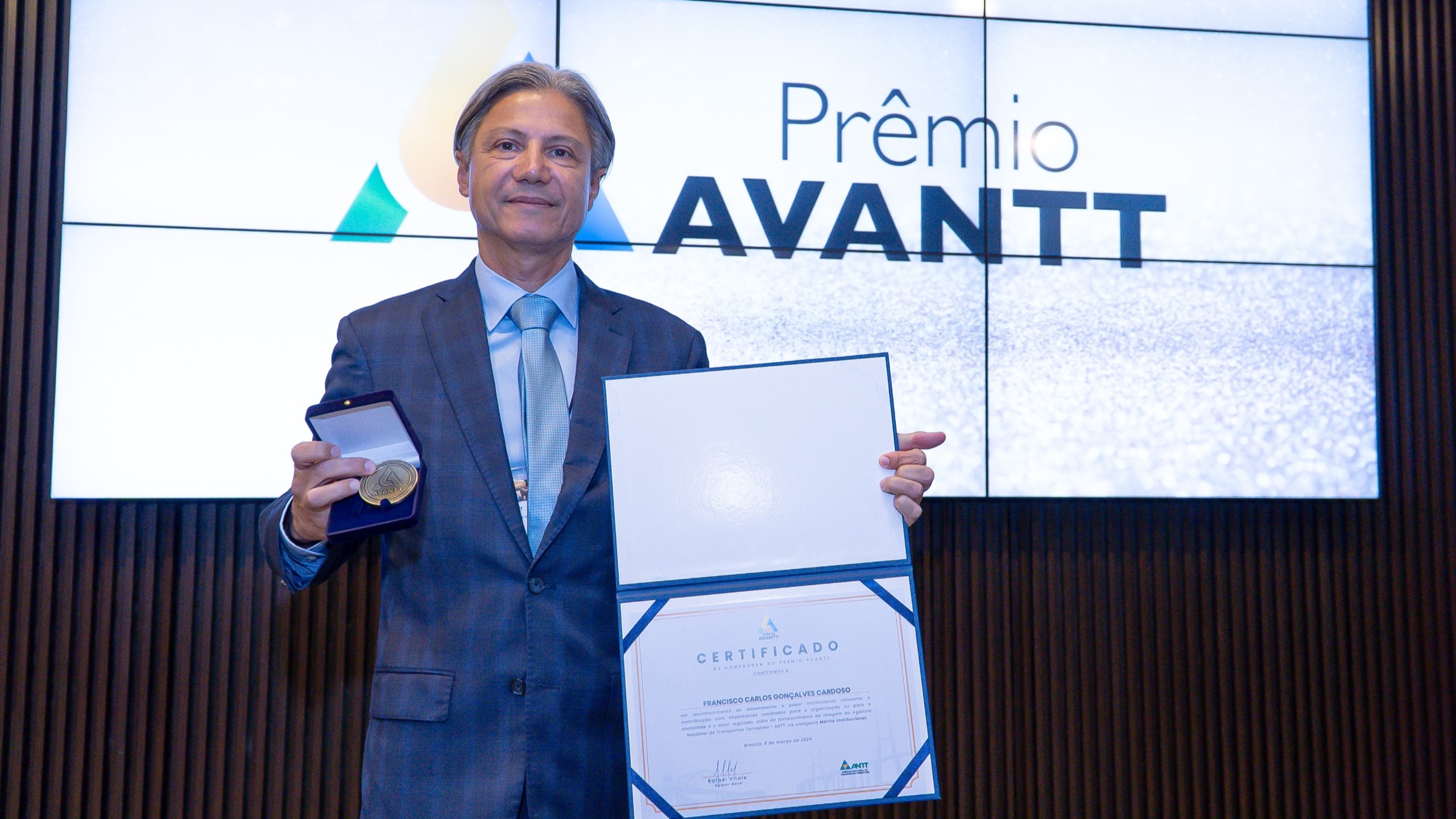 O Sr. Francisco Cardoso, ex-presidente da ABTI e atual 2° Vice-Presidente da entidade, recebeu nesta quarta-feira (6) o Prêmio AVANTT 2024, conferido pela Agência Nacional de Transportes Terrestres (ANTT) às personalidades que contribuíram para o setor de transportes terrestres no Brasil.